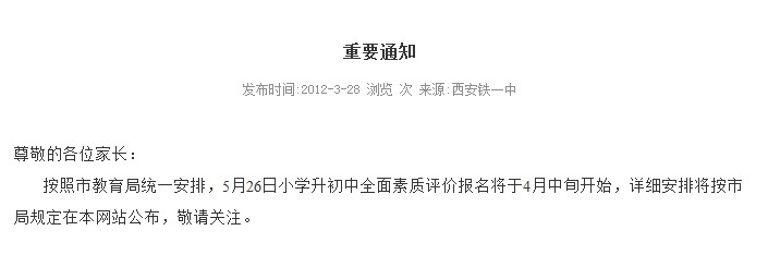 近日,登陆铁一官网报名的家长会发现铁一官网报名窗口已经关闭。而关于小升初报名,今日,铁一在其官网上又发出了一项重要通知。通知内容如下: