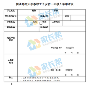 2018年新初一师大教职工子女名单公示2018年新初一师大教职工子女正在确认,现已将子女名单公示于附中网站,请适龄学生的家长上网查对并相互告知。若公示名单中没有的学生,请家长及时下载附件1(见“公示名单”后),填写表格并盖上公章(单位公章、人事处公章)交至附中招生办公室(崇是楼五层505室),截止时间为2018年4月2日下午4:00。名单见下:附件>> 附件1:陕西师范大学教职工子女初一年级入学申请表.docx