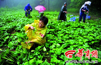 昨日中午,胡小黎和老乡冒着绵绵细雨,一起在地里采摘红薯叶子 记者 陈团结 摄