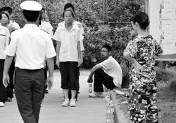军训开始刚过7分钟,一个女学生手按着左腿一瘸一拐朝医务室走去了。