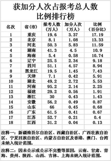 编者按 自2006年以来,媒体一直对高考加分中的种种不公平现象保持关注并持续报道。越来越多的事实表明,由于加分制度本身设计不够严密,由于对权力的制约监督形同虚设,由于运作过程的不透明不公开,高考加分政策在一些地方被严重异化,成了某些权钱交易的腐败通道,极大损害了其他考生的正当权益和整个社会的公平正义。 研究发现,高考加分在许多地方成为社会管理的手段之一;高考加分泛滥,在重庆等地方,近5个考生中就有一个加分的;高考加分呈现“三集中”特征,即向区域内的相对发达地区或中心城市,以及少数中学和个别项目集中;黑龙江、湖北等一些地方公示的加分考生信息比较完整,而山东、宁夏等一些地方在关键信息上“遮遮掩掩”,云南等一些地方则根本没有按规定时间公示;100多所重点高校对高考加分的态度也不一。 研究结果表明,权力和金钱越来越向高考加分领域渗透。 高考加分政策涉及千千万万考生及其家庭的切身利益。倾听民声,顺应民意,清理规范高考加分政策,从源头上遏制权钱交易腐败现象,维护高考公平正义,尤为迫切。 “教育部的加分规定只有14种,全国各省、市、自治区却有近两百种”,这是媒体报道高考加分乱象时,经常引用到的数据。 记者根据统计发现,有些地区加分项目纷繁复杂,甚至有成为普惠型加分之势,但有些地区能获得加分的人数在该省考生人数中所占的比例微乎其微。 这种对比,也从另一个角度体现出高考加分在我们这个时代所遭遇的困惑,加还是不加已经成为了一个问题。 同时,这一对比与那些加分大省频频爆出的丑闻和质疑,又构成了整个高考加分乱象这一现实图景,不论取消与否,清理整顿高考加分已势在必行。 重庆近5个考生中就有1人获加分 2010年,江西省共有311651人参加高考,在江西教育网的公示中,只有441人获得加分资格,加分人数只占考生总数的0.13%。 这441人中,体育加分64人,包括华侨归侨子女、台湾省籍考生、奥赛获奖者、自谋职业退伍士兵、烈士子女等项目在内一共才74人,少数民族获加分的共303人。 与此形成鲜明对比的是重庆、北京、河北等地。2010年重庆市高考报名人数为196759名,是全国仅有的四个增加人数的省市之一。重庆今年高考加分人数为3.37万人,占考生总数约17.19%。从获得加分的几率来说,重庆是江西的约130倍。即使减去占大头的少数民族考生13000多人,仍有两万多人获得其他项目加分。 值得注意的是,今年重庆市已经大幅减少了高考加分的项目和分数,比如2009年重庆共有6.5万人获得高考加分,加分人数超过考生总数的30%。 除此之外还有北京。北京今年获加分的人数近1.1万人,占全部考生8.1万人的1/8强。即使减去少数民族考生6700余人,仍有4000余人获得加分。 河北也是如此。2010年,河北省高考报考人数为50.3万人;各项优惠政策共公示5.83万人次,占考生总数的11.6%。除少数民族加分24000余人外,仍有3万余人获得加分。 值得注意的是,虽然山东省今年宣称取消所有省内制定的高考加分政策,但是,仍有4547人获得高考加分照顾,不过其中少数民族考生占绝大多数,有4165人,其余382人属于其他类型加分。据报道,山东省教育招生考试院之所以要取消省内加分的“土政策”,是考虑到一些政策初衷虽然很好,但执行起来很难,很容易背离初衷,容易成为不正之风,引起群众不满。 加分项目各自为政 从那些加分大省(区、市)来看,可以看到加分项目在设置上各自为政,在加分分值上有多有少,在名称上五花八门,在范围上又千差万别。 教育部规定,有关省(区、市)确需增加的政策性照顾项目,须经本省级普通高校招生委员会研究确定,并报教育部核准备案后方能向社会公布。于是,在教育部的加分项目基础上,一些省、市、自治区招生委员会又制定了名目繁多的加分项目。 这些加分项目数量众多、内容复杂。例如在《四川省2010年普通高等学校招生实施规定》中,“录取照顾政策”长达2100余字,共16项加分大类。广东省的体育类加分项目尤其繁多,一些项目如轮滑球、花样轮滑、毽球等不为人熟识。 有很多加分项目属于地方政策。如河北省规定,“省授予‘教育世家’称号的教师直系子女报考师范院校的增加20分”。黑龙江省规定,“在我省工作的省级(含)以上优秀专家的子女,在所报省内院校调档线下降低20分投档,由院校审查决定是否录取”。甘肃省规定,“高级中等教育阶段思想政治品德方面有突出事迹,经市(州)党委、人民政府及教育行政部门表彰,由新闻媒体报道,在社会上有较大影响者,录取时文化课加10分”。重庆市规定,“报考市属院校的农村独生女在各批次控制分数线下5分内视为达到最低录取控制分数线”。湖北、河北也有类似规定。此外,河北省规定独生子也可以获得高考加分。辽宁省规定:“实行朝鲜语、蒙古语和汉语双语教学的民族中学毕业的朝鲜族和蒙古族考生,录取时总分增加10分。”辽宁省仅这一项的加分人数就达5402人。 内蒙古自治区今年仍有一人获得“非典医务人员子女”加分,宁夏回族自治区有一人因获“自治区优秀青年”而加分。 针对同一项目的加分分值也相差悬殊。在河北省,“国际科学与工程大奖赛或国际环境科研项目奥林匹克竞赛中获奖者”加分为10分,同一项目在云南省加分为20分。 湖南省体育竞赛优胜者经统一测试合格后,省级的可获加20分,市