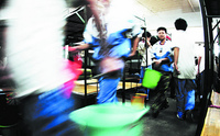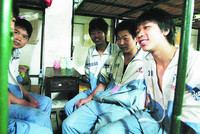 挤在床铺边,学生们在一起闲聊。“和谐楼”200多名男生关系融洽、气氛活跃,亲如自家兄弟一样,真正体现出这个大家庭里的“和谐”。