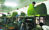 “刚来时,我被寝室环境吓住了:200多人共处一室,坑坑洼洼的水泥地面,”学模具专业的易建林说,“早晨6时10分起床,6时20分进教室。学校对寝室内务要求严格,以‘被子成一块、床单成一面、物品成一线’的兵营寝室为标准。我们一般晚上都准备好洗漱用水,以节省早上时间。现在我已完全习惯这种准军事化的生活节奏。”