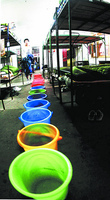 晚上熄灯前,同学们快速地提着水桶准备好早晨用的洗漱水。