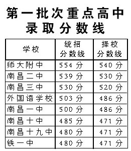 重点高中择校生是按重点高中择校生招生计划,依考生填报的择校志愿划线录取。各校的择校线分别为:南昌一中486分、南昌二中530分、南昌三中520分、南昌十中471分、南昌十九中471分、师大附中540分、铁一中471分、外国语学校486分。与统招分数线一样,第一批次8所省重点高中的择校线也均有不同程度的下降。