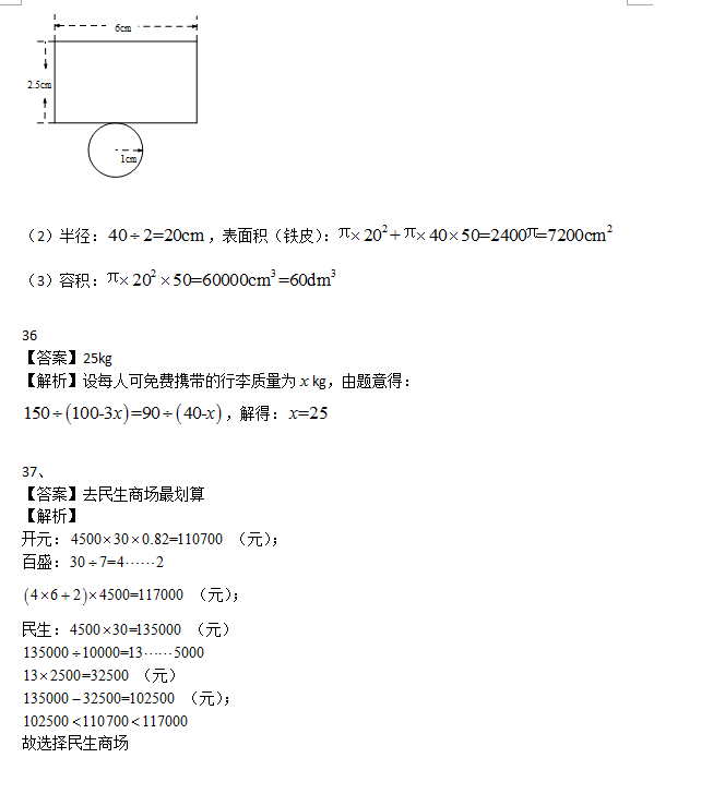 综合来看这份卷子,题目还是贴近于生活,图形题依旧是比例最大的,而且今年加大了立体图形的考察力度,比如说烧饼这个题,很生活化,有新意,但是考察的是一个圆柱的问题;经济问题一如既往地出现,今年几乎是照搬往年真题,商场打折这个题是一个真卷中反复出现非常老的题型;飞机行李这个题也是以前真卷中的原题;单位换算这个题跟西安有关系,很本地化。