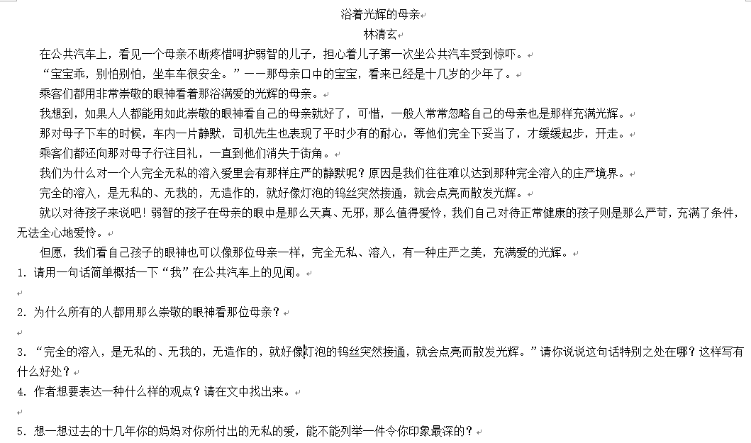 阅读题要答好还是要回到阅读上,为了帮助孩子提高阅读水平,小编会每天选择一篇篇幅短的小文章来让孩子阅读。今天小编选取《浴着光辉的母亲》来做相关练习题。