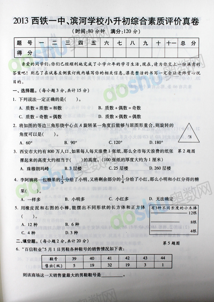 西安奥数网10月12日 2013西铁一中、滨河学校小升初综合素质评价真卷高清版本,供2019小升初家长和孩子下载查看。