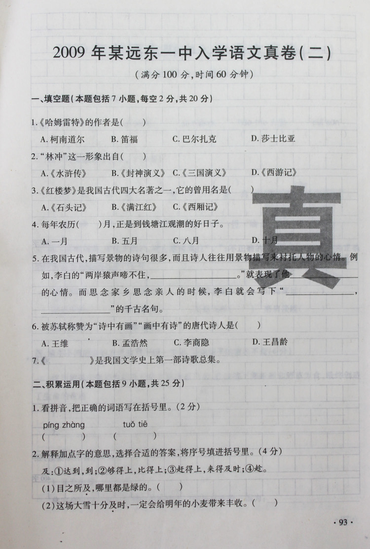 西安奥数网9月13日 小升初做真卷是一个必要的过程。充分了解目标校的命题趋势,才能更有把握。小编将2009年远东一中入学语文真卷进行了整理。如果有任何疑问,都可以留言给我们,或进入e度论坛-小升初版块咨询我们的老师。