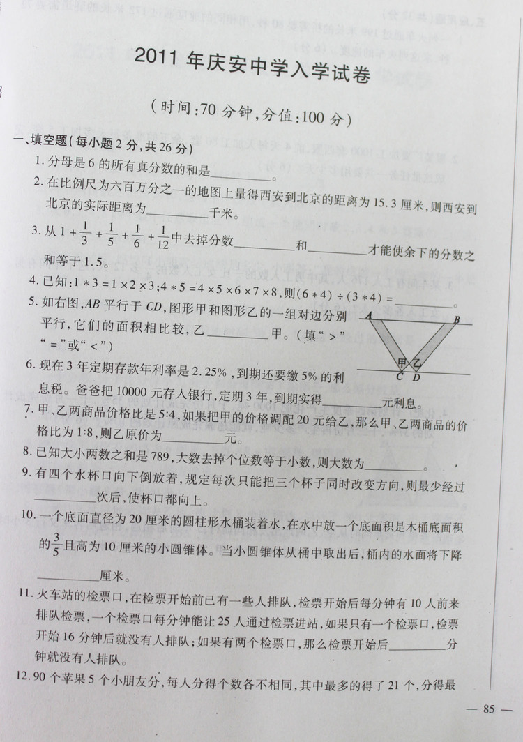西安奥数网9月13日 小升初做真卷是一个必要的过程。充分了解目标校的命题趋势,才能更有把握。小编将2011年庆安中学入学数学真卷进行了整理。如果有任何疑问,都可以留言给我们,或进入e度论坛-小升初版块咨询我们的老师。