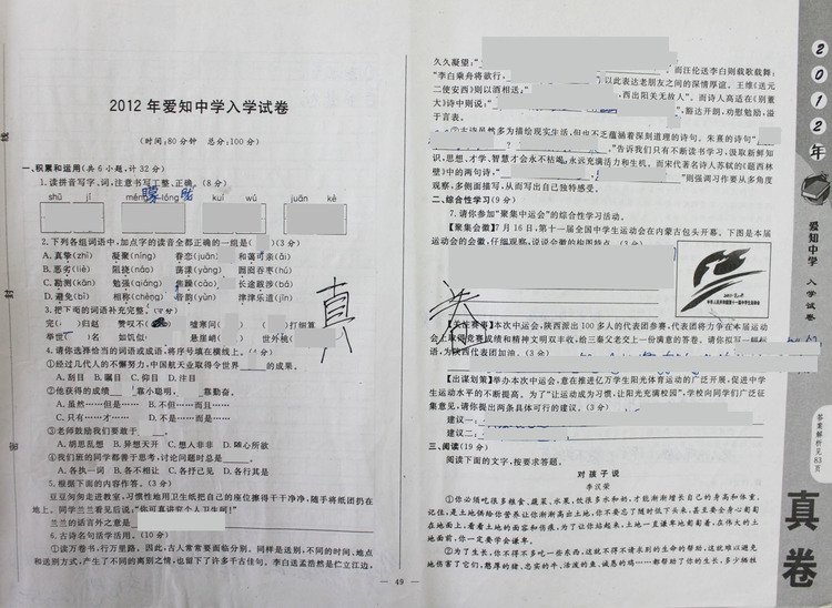 西安奥数网9月13日 小升初做真卷是一个必要的过程。充分了解目标校的命题趋势,才能更有把握。小编将2012年爱知中学语文入学真题进行了整理。如果有任何疑问,都可以留言给我们,或进入e度论坛-小升初版块咨询我们的老师。