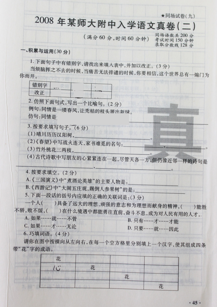 西安奥数网9月12日 小升初做真卷是一个必要的过程。充分了解目标校的命题趋势,才能更有把握。小编将2008年师大附中的真题进行了整理。2008年师大附中小升初入学考试语文真卷共两套。本套为第一套。如果有任何疑问,都可以留言给我们,或进入e度论坛-小升初版块咨询我们的老师。