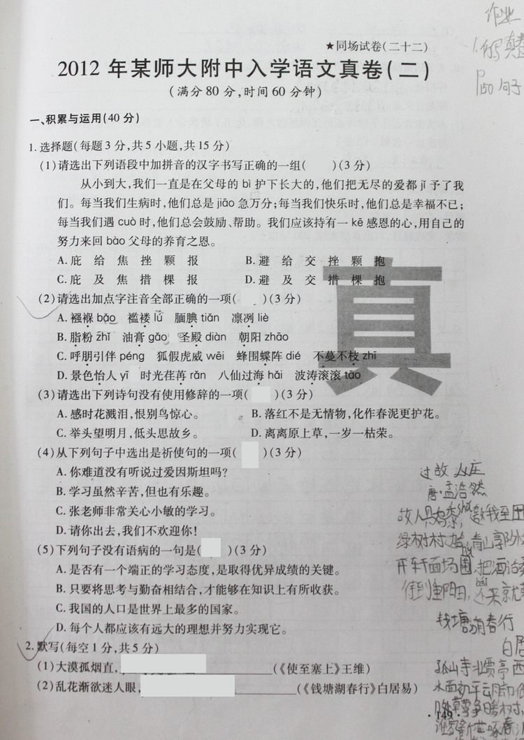 西安奥数网9月12日 小升初做真卷是一个必要的过程。充分了解目标校的命题趋势,才能更有把握。小编将2012年师大附中的真题进行了整理。2012年师大附中小升初入学考试语文真卷共四套。本套为第二套。如果有任何疑问,都可以留言给我们,或进入e度论坛-小升初版块咨询我们的老师。