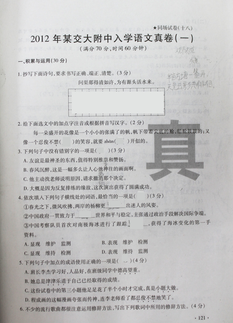 | 2012年交大附中入学语文真卷(一) |