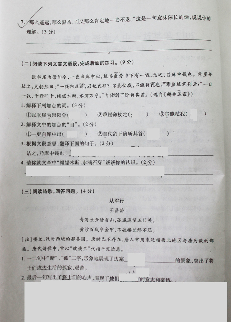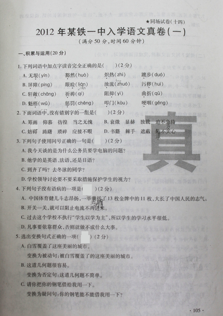 2012年铁一中入学语文真卷(一)