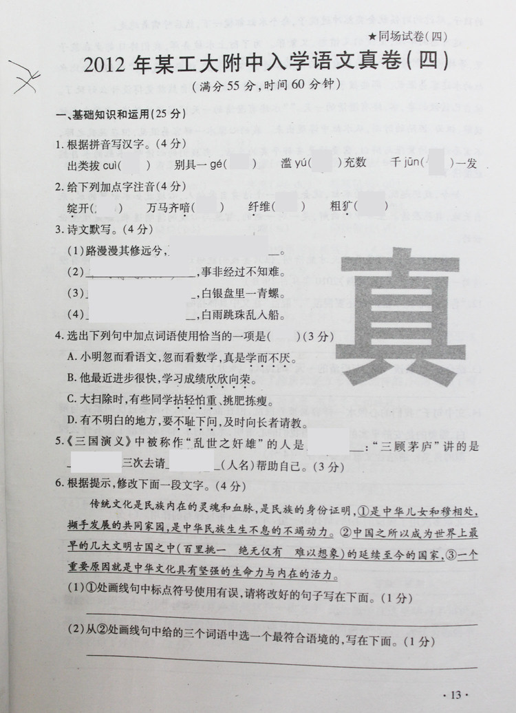 西安奥数网9月11日 小升初做真卷是一个必要的过程。充分了解目标校的命题趋势,才能更有把握。小编将2012年西工大附中的真题进行了整理。2012年西工大附中小升初入学考试语文真卷共六套。本篇为第四套。