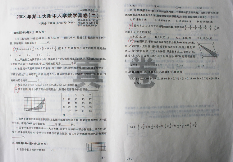 西安奥数网9月3日 小升初做真卷是一个必要的过程。充分了解目标校的命题趋势,才能更有把握。小编将2008年西工大附中的真题进行了整理。2008年西工大附中小升初入学考试数学真卷共五套。本篇为第二套。