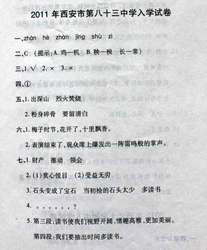 西安奥数网2月22日 小升初做真卷是一个必要的过程。充分了解目标校的命题趋势,才能更有把握。小编将2011年西安小升初中西安市八十三中(行知中学)的入学真题进行了整理。2011年83中的小升初入学考试语文真卷共一套。