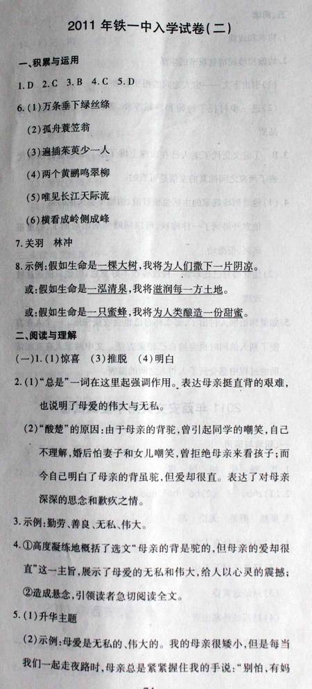 西安奥数网11月29日 小升初做真卷是一个必要的过程。充分了解目标校的命题趋势,才能更有把握。小编将2011年西安铁一中的真题进行了整理。2011年铁一中小升初入学考试语文真卷共二套。本篇为第二套。
