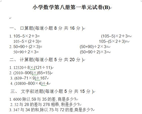 小学数学第八册第一单元测试B