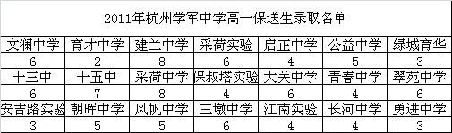 相对于:2008年(下图):2011年杭州学军中学高一保送生录取名单出现了很大的变化,首先最突出的变化是文澜中学的保送名额急剧下滑,由原来的25个名额急剧缩减到6个名额,另外十三中、十五中在保送工作中的优势也没前几年明显,名额也是缩水严重,总的来说学军中学的保送名额经过08年到11年逐渐平均,将机会留给了更多的初中。