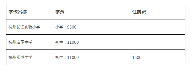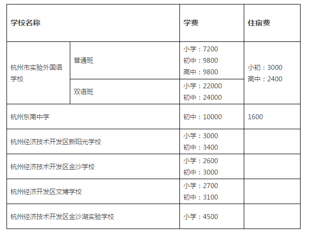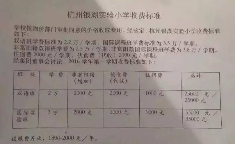 富阳区今年新建了银湖实验小学、银湖实验中学,永兴学校总校参与投资。初中部目前尚未确定,小学的收费标准见下图。