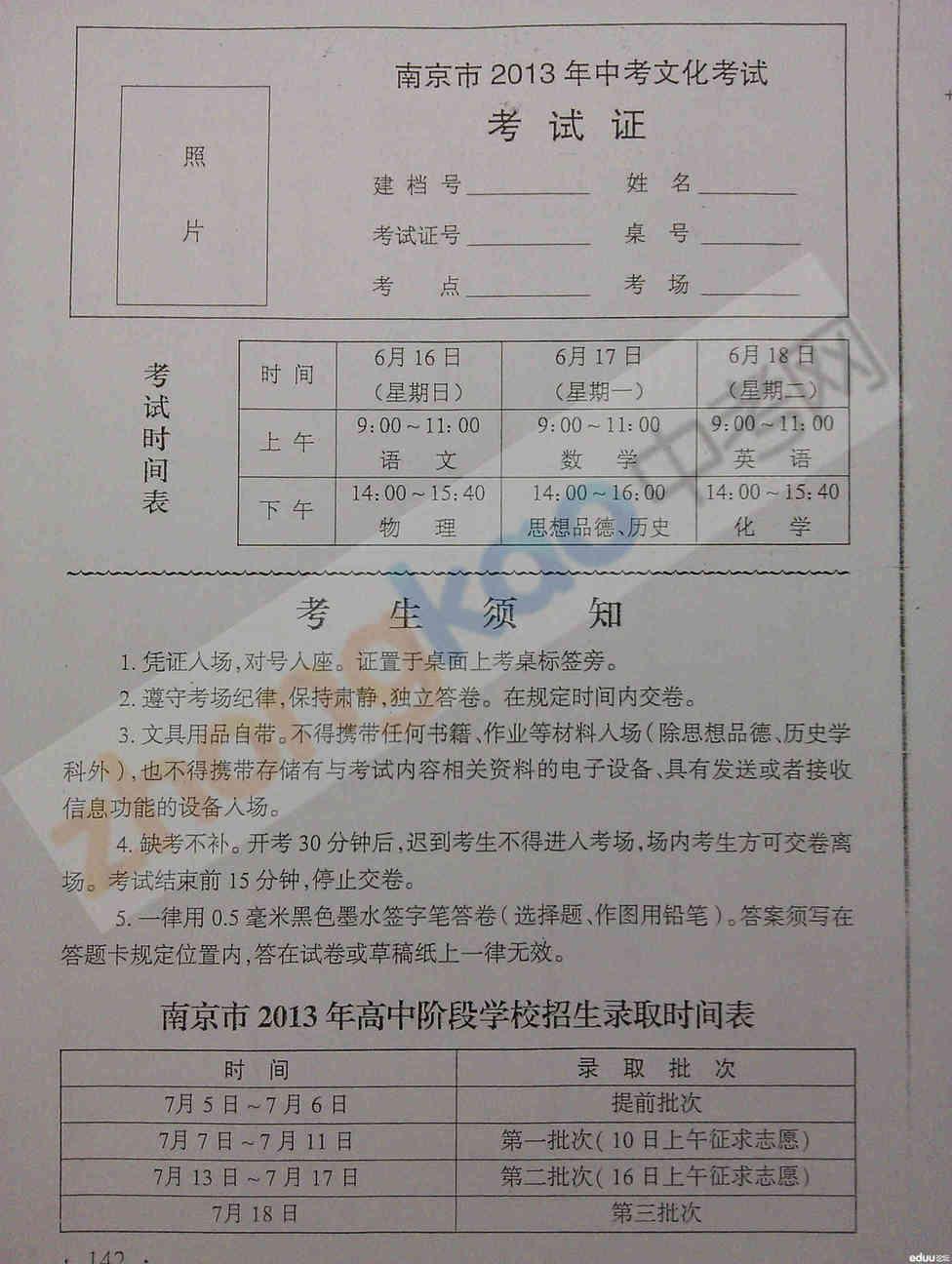 南京中考网:2013年中考在即,中考指南上已经给出今年准考证样式,考生及家长可参考指南上的考试时间及录取时间安排好相关事宜。
