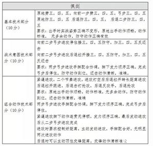 (4)评分办法:基本动作和技巧动作各占总分的15%,舞蹈片段占60%,动作即兴和目测各占5%。附表如下: