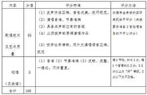 (3)评分办法:声乐(演唱、艺术表现)成绩95%,视唱五线谱5%。附表如下: