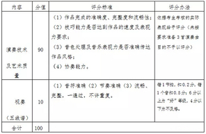 ②考评项目:a.作品完成的准确度、完整度和流畅性;b.技巧能力是否达到作品的速度及表现力要求;c.音色处理及音乐表现力是否准确传达作品风格; d.协奏能力。