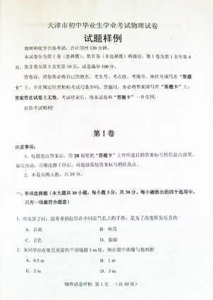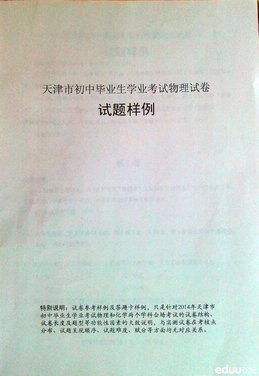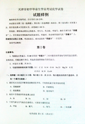 物理化学试卷不是之前的一张张卷子,而是变成了一本小册子,物理和化学是装订在一起的,这里说明一下:试卷参考样例及答题卡样例,只是针对2019年天津市初中毕业生学业考试物理和化学两个学科合场考试的试卷结构、试卷长度以及题型等功能性因素的大致说明,与实测试卷在考核点分布、试题呈现顺序、试题难度、赋分等方面均无对应关系。
