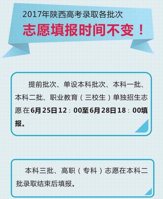 2019年陕西高考志愿填报时间:6月25日12:00开始。2019年陕西高考填报志愿设置第二十二条2019年陕西省普通高校招生录取批次设置为提前批次、单设本科批次、本科一批、本科二批、本科三批、高职(专科)批次。单设本科批次为面向国家级集中连片特殊困难县(区)...