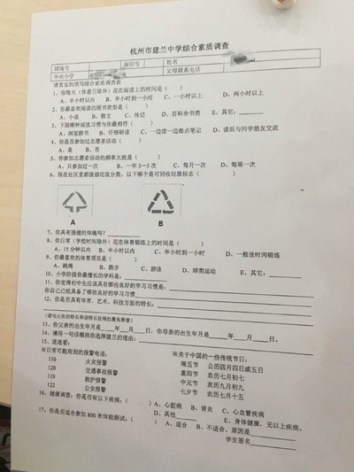 建兰中学的自主招生从早上8点开始,分批进行,半天结束。但是从7点开始,学校门口就有家长和学生沿着抚宁巷排队,一眼望不到头谈前,每位学生先填下面这份综合素质调查问卷:爸爸妈妈的生日是哪一天?可回收垃圾的标志是哪一个?参加志愿活动的频率怎么样?每...