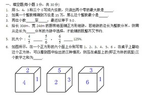 部分试题:一、填空题(每小题3份,共30分)1、在比例尺是1:7000000的地图上,量得西安到青岛的距离是20厘米,那么西安到青岛的实际距离大约是_____千米.2、温家宝总理有一句名言:”多么校的问题,乘以13亿,都会变得很大;多么大的经济总量,除以13亿,都会变的很...