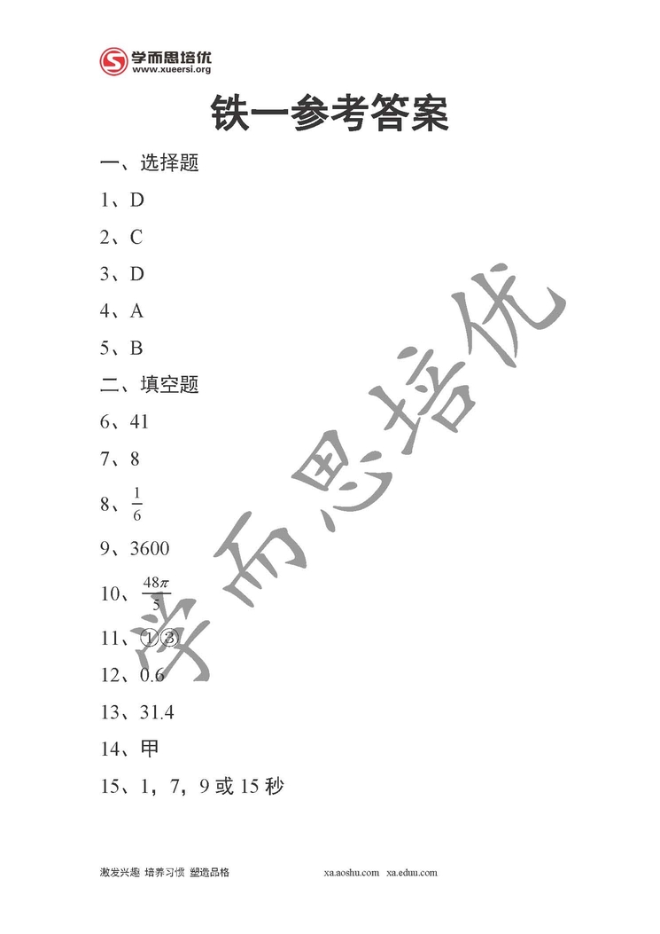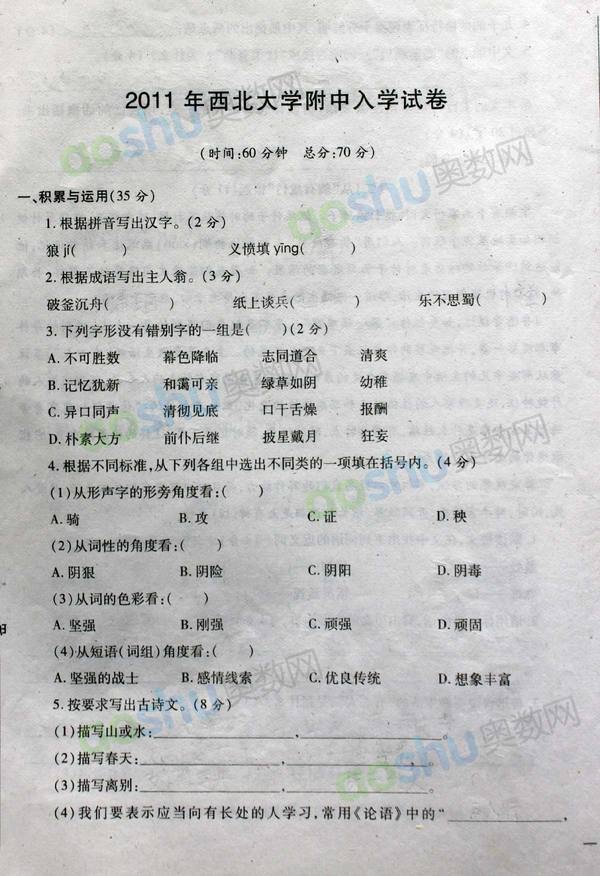 西安奥数网2月22日 小升初做真卷是一个必要的过程。充分了解目标校的命题趋势,才能更有把握。小编收集了2011年西安小升初西北大学附中入学真题,供小升初孩子和家长下载学习。(最后一页附有答案和试题高清版下载)下一页:答案和试题高清版下载 请下载附件....