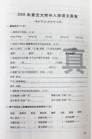 西安奥数网11月29日 小升初做真卷是一个必要的过程。充分了解目标校的命题趋势,才能更有把握。小编收集了2011年西安小升初中交大二中的的入学语文真题。供大家下载学习。(最后一页有有答案和试题高清下载版) 请下载附件:《2011年交大二附中入学语文真卷》...
