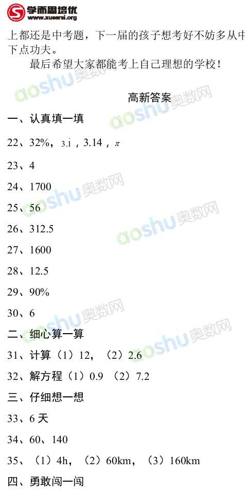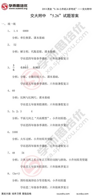 西安奥数网5月28日 5月27日,西安市教育局公布了参加“5·26”民办学校小升初综合素质测评“四大名校”的测试题,这四所学校包括高新一中初中校区、交大附中分校、西工大附中分校、西安铁一中分校。西安奥数网第一时间联合西安知名...