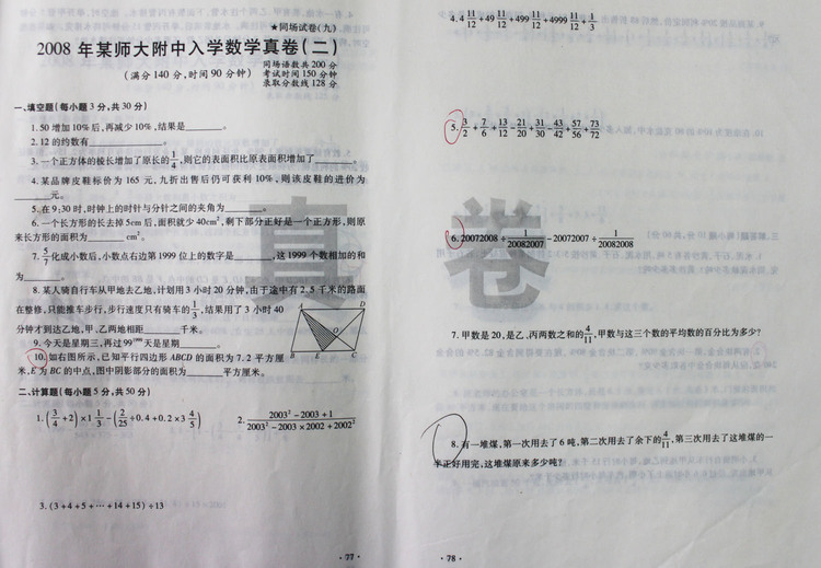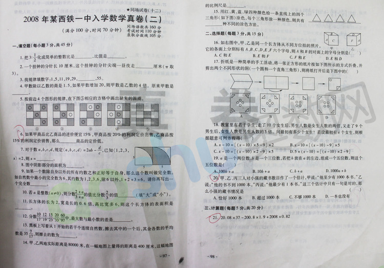 西安奥数网9月3日 小升初做真卷是一个必要的过程。充分了解目标校的命题趋势,才能更有把握。小编将2008年铁一中的真题进行了整理。2008年铁一中小升初入学考试数学真卷共三套。本套为第二套。如果有任何疑问,都可以留言给我们,或进入e度论坛-小升初版块咨....