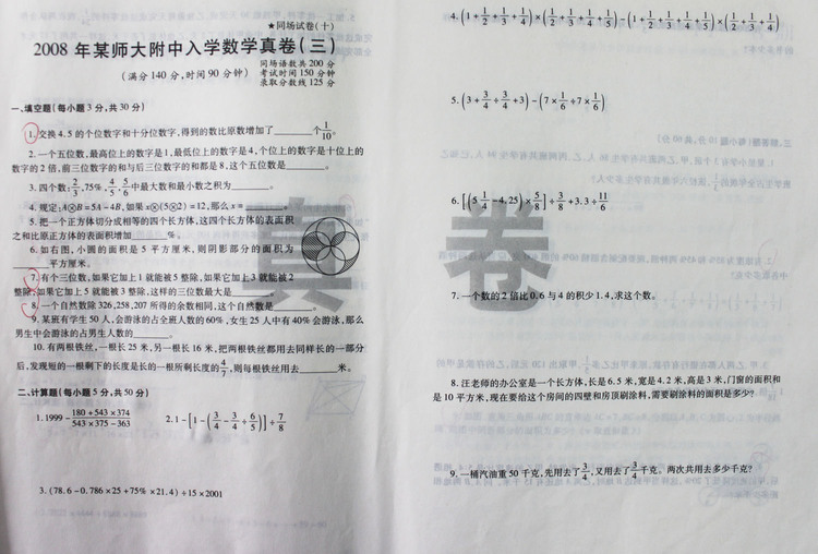 西安奥数网9月3日 小升初做真卷是一个必要的过程。充分了解目标校的命题趋势,才能更有把握。小编将2008年师大附中的真题进行了整理。2008年师大附中小升初入学考试数学真卷共三套。本套为第三套。如果有任何疑问,都可以留言给我们,或进入e度论坛-小升初版....