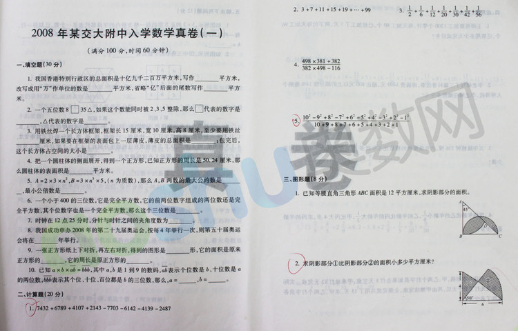 西安奥数网9月4日 小升初做真卷是一个必要的过程。充分了解目标校的命题趋势,才能更有把握。小编将2012年交大附中的真题进行了整理。如果有任何疑问,都可以留言给我们,或进入e度论坛-小升初版块咨询我们的老师。高清版请下载附件:2008年交大附中入学数学....