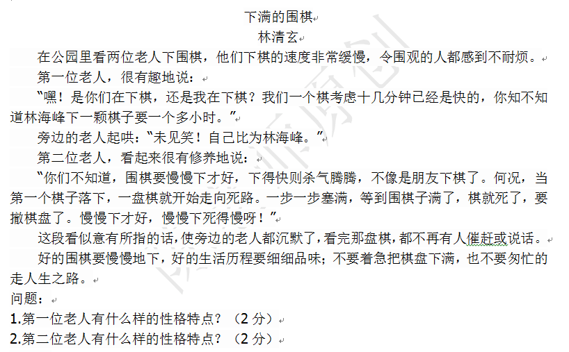 阅读题要答好还是要回到阅读上,为了帮助孩子提高阅读水平,小编会每天选择一篇篇幅短的小文章来让孩子阅读。今天小编选取林清玄的《下满的围棋》来做相关训练。点击下页看答案答案解析相关链接:西安小升初语文阅读真题天天练汇总......