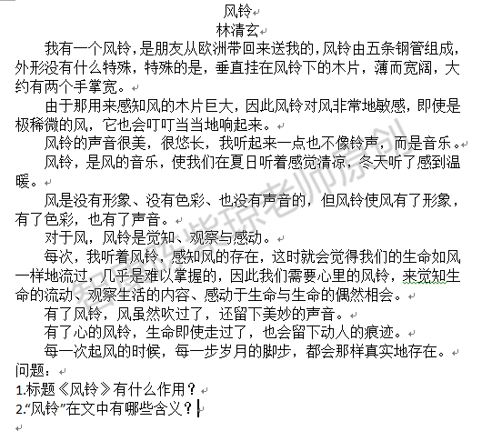 阅读题要答好还是要回到阅读上,为了帮助孩子提高阅读水平,小编会每天选择一篇篇幅短的小文章来让孩子阅读。今天小编选取林清玄《风铃》来做相关训练。【点击下页看答案解析】【答案解析】相关链接:西安小升初语文阅读真题天天练汇总......