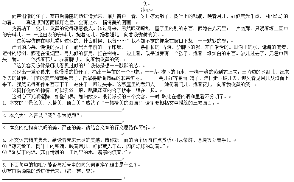 阅读题要答好还是要回到阅读上,为了帮助孩子提高阅读水平,小编会每天选择一篇篇幅短的小文章来让孩子阅读。今天小编选取冰心的《笑》来做相关练习题。【点击下页答案解析】【答案解析】相关链接:西安小升初语文阅读真题天天练汇总......