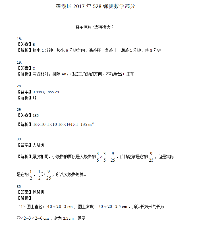 分析:今年莲湖区数学部分一共9个题目,图形题占了5个题目;跟经济有关的计算题2个,1个简单生活时间优化问题,1个单位换算的题。综合来看这份卷子,题目还是贴近于生活,图形题依旧是比例最大的,而且今年加大了立体图形的考察力度,比如说烧饼这个题,很生....