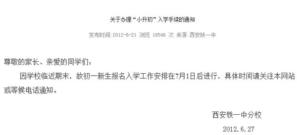 继21号延迟入学手续办理后,铁一中再次发布通知称,因临近期末,新生入学报名工作安排至7月1日后。这是2012年铁一中第二次延迟入学手续办理。据了解,6月22号-30号是教育局统一规定的办理“小升初”入学、注册、缴费手续的时间。因6月22号是中考,....